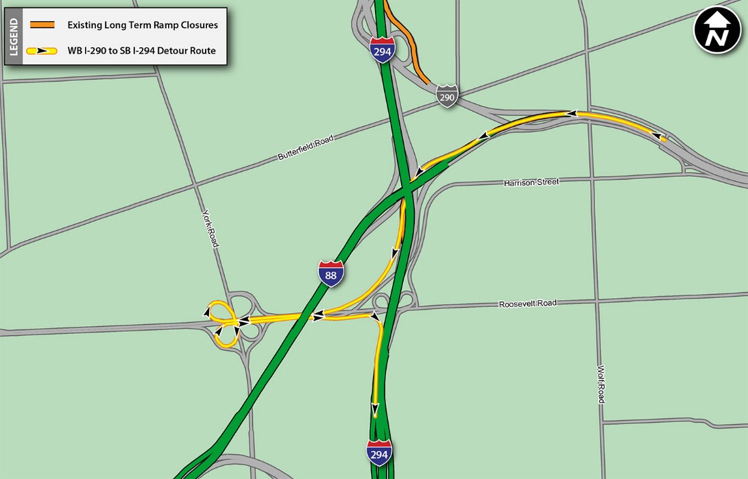 The ramp connecting westbound I-290 to the southbound Tri-State Tollway (I-294) is scheduled to close through 2026. A de… Full details below