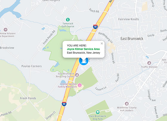Map shows the New Jersey Turnpike zoomed to the plaza. Zoom out for the entire road. Select markers for options.